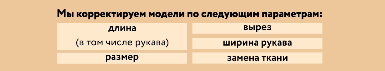 - что вы хотите изменить: ваш размер (сверившись с нашей таблицей), либо ваши мерки (обхват талии, обхват груди, обхват бёдер, ширина рукава, длина изделия)
