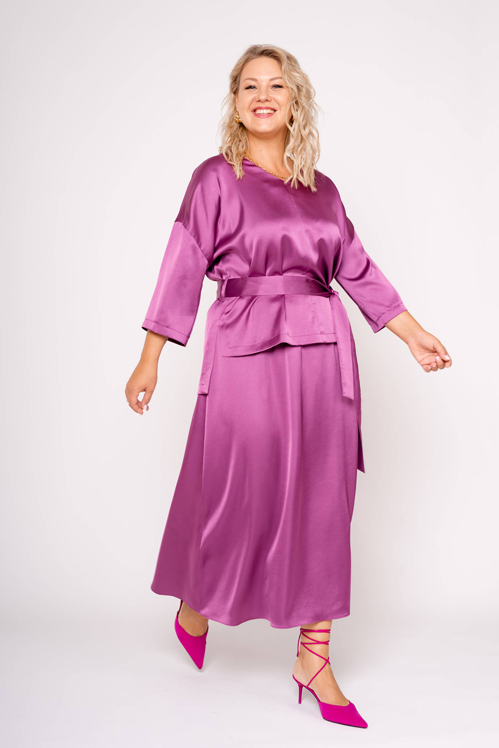 Комплект из атласной юбки и модной блузы на поясе цвета модной фуксии — настоящий хит для вашего праздничного настроения.