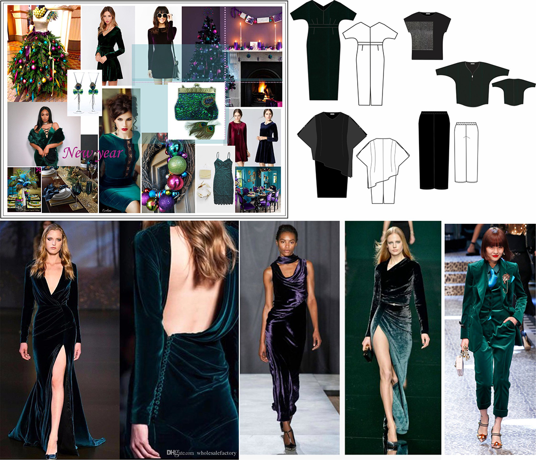 Бархат, кружево с цветом люрекса «черный никель», джерси в сочетании двух фактур черной и блестящей. Легкие шифоны с декором из жемчуга по рукавам.