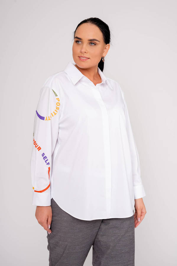 Классическая рубашка прямого силуэта с текстовым принтом. Воротник отложной со стойкой. Безвытачная основа. Застежка планка на пуговицах. Втачной рукав с манжетами на пуговицах. Кокетка со встречной бантовой складкой по спинке. Модель выполнена из лёгкого хлопкового полотна с добавлением полиэстера и эластана.