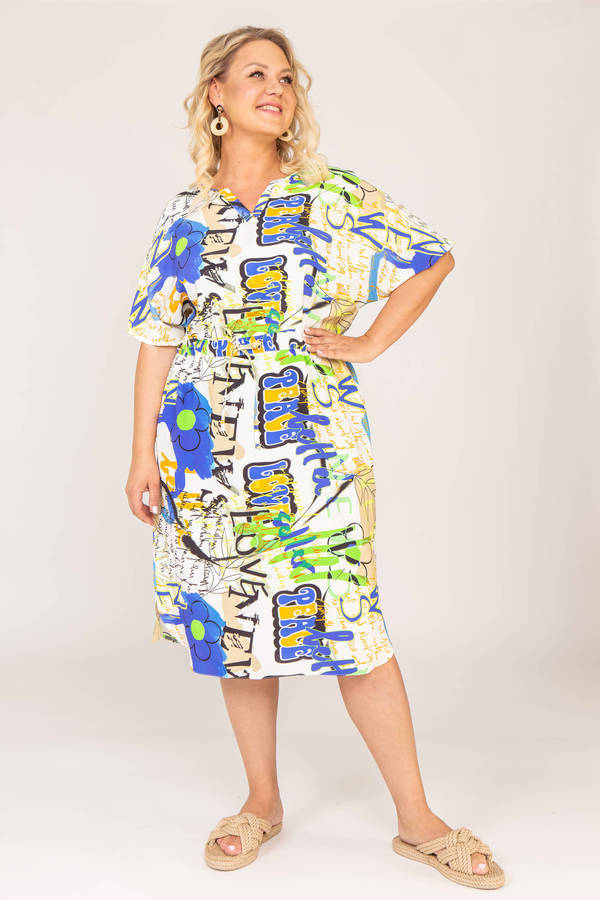 Платье полуприлегающего силуэта с кулисой по талии. Горловина оформлена "V" - образным вырезом. Цельнокроеный рукав. Модель с принтом в насыщенных кислотных оттенках дополните базовыми аксессуарами и обувью.