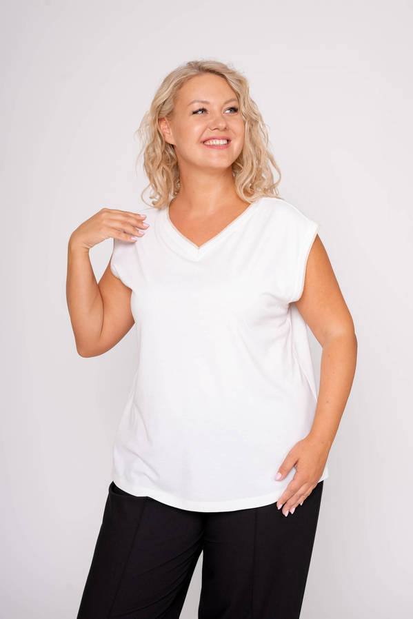 Топ из блузочной вискозы с эластаном. Свободного силуэта. Горловина "V" образная с подвязом. Пройма с притачным подвязом.