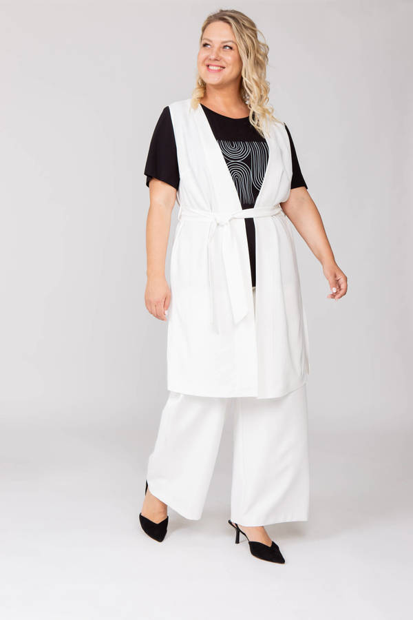 Удлиненный жилет с разрезами. Вытачки из бокового шва. V - образный вырез. Материал основы – вискоза с добавлением эластана. Дополните жилет базовой футболкой и брюками палаццо из этой же капсулы.